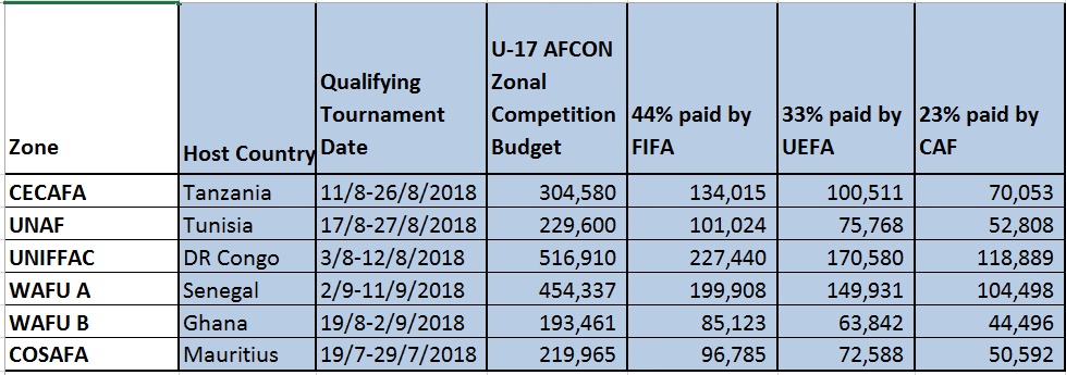According to an agreement between CAF and UEFA, the European confederation would fund a huge portion (33%) of the zonal qualifying expenses by paying directly for the accommodation expenses.