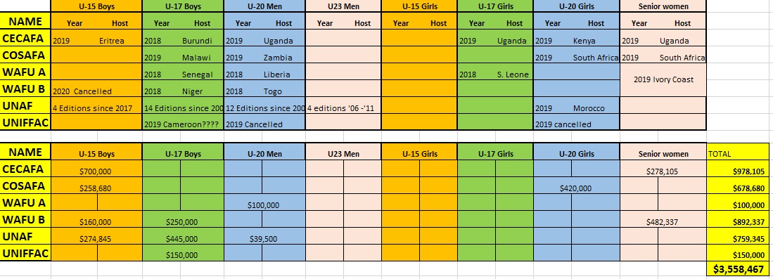 By the end of 2018, each of the zonal unions of CAF had received at least $2 million for their activities in the period 2017 -2018. However, an analysis of the competitions in that period shows that most fell short of the stipulated requirement threshold of 1(one) women’s, 2 (two) boys and 2 (two) girls competitions.