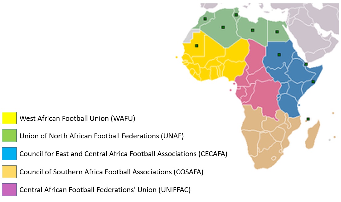 Africa and its 54 members of CAF and FIFA is further sub-divided into 6 (six) Zonal Unions, based on proximity.