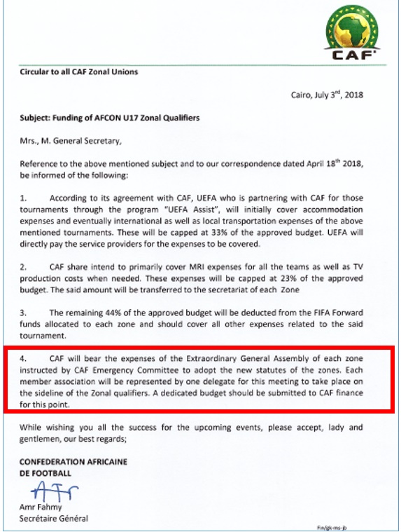 The zonal Unions are so critical to the voting patterns at CAF that when they host the zonal finals for the various competitions, they are compelled to have their extraordinary General assemblies, which imply that all the FA Presidents from each member FA must attend. CAF even sent out a circular instructing the zonal unions that CAF would foot the expenses for all these EGAs.