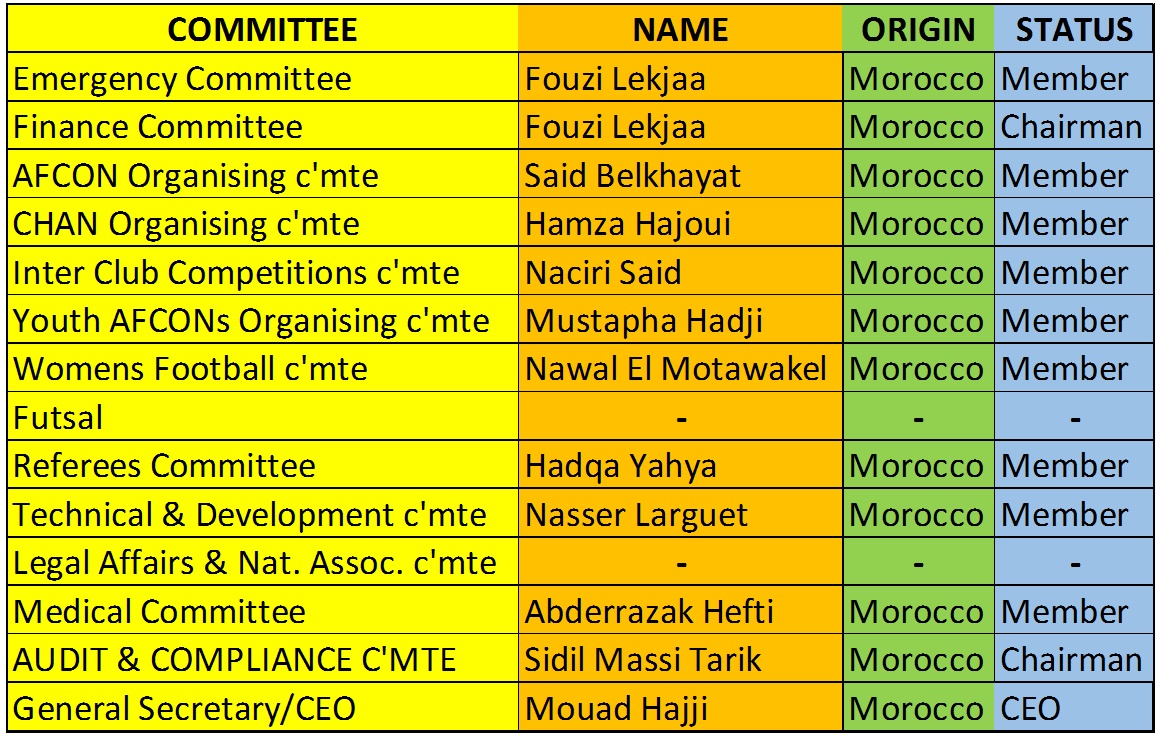 Fouzi Lekjaa seemed only intent in consolidating his power in CAF as evidenced by stuffing of his Moroccan stalwarts in majority of the CAF standing committees and the hiring of a Moroccan dentist (Mouad Hajji) to the post of CAF General Secretary.