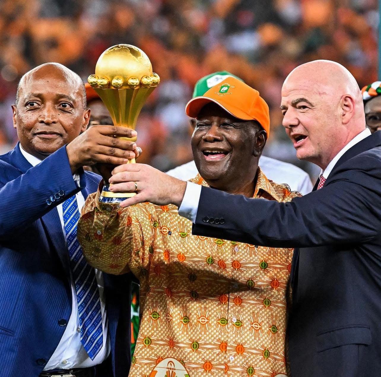 CAF President Patrice Motsepe (far left) Ivory Coast President Alassane Ouattara (middle) and FIFA President Gianni Infantino
